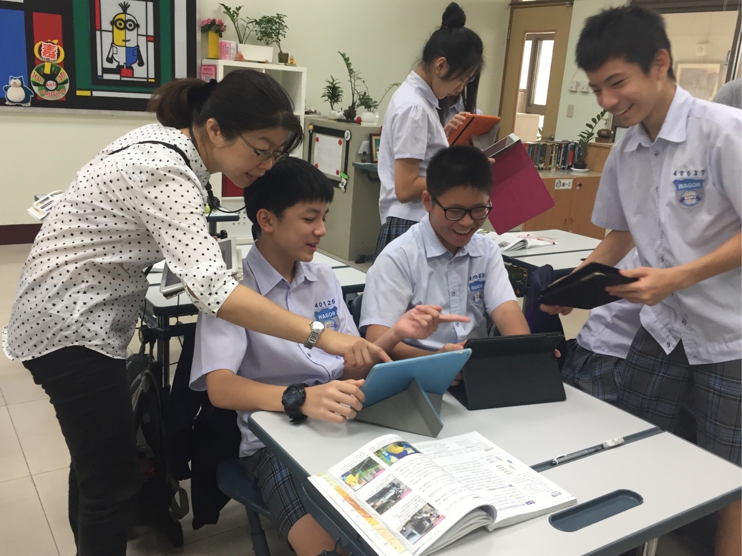 黃文貞老師也非常感謝學校的支持,不但補助全校教職員工購買iPad並舉辦多場的研習讓種子老師能全心投入行動學習,再加上種子團隊的同心協力也在去年拿下全國行動學習高中組特優獎。自103學年度開始,行動學習在葳格高中董事會的全力支持下,全校開始發展iWagor計畫,在各領域間全面推行翻轉教室,也發現善用工具不但可以增加學生學習意願、減輕教師教學的負擔,對於學生的學習成效更有正面的影響。學校也希望藉由各種科技工具與數位媒體來引起學生學習的慾望、激發學習的興趣激盪出創造力與應用力。