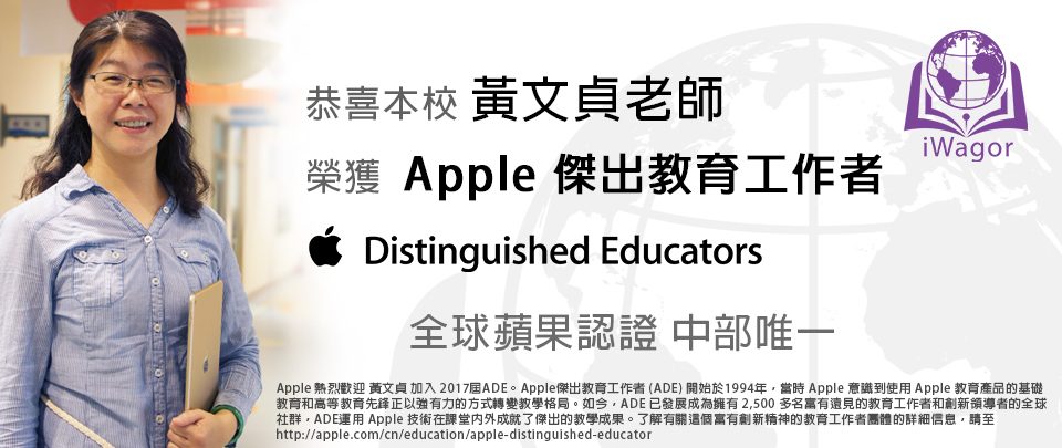 恭喜 本校黃文貞老師榮獲「Apple傑出教育工作者」(Apple Distinguished Educator – 簡稱ADE)