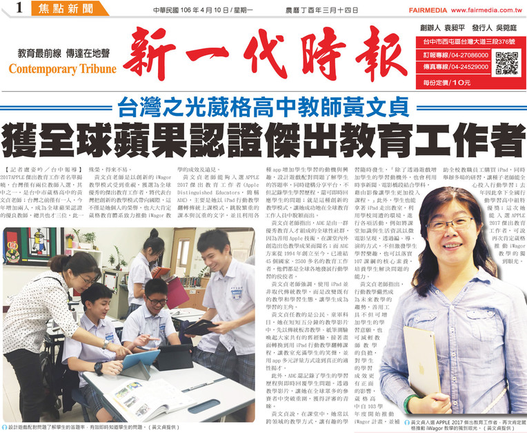 入選人之一的黃文貞老師目前任職於臺中市葳格高中,當初參賽影片即以任教科目:公民、童軍突破全球參賽者的重圍獲得評審青睞,影片中以傳統板書教學、紙筆測驗喚起大家舊經驗,轉換畫面融入行動教學翻轉課程讓教室充滿學生笑聲,用多元評量方式適性揚才,記錄學生學習歷程並藉同儕力量加強學習成效。在其課程中常以跨領域教學的方式,讓學習可以隨時發生,以時事結合學科,讓學生拿著iPad走出教室,並利用學校周遭的環境,進行各項活動,不但激發學生學習樂趣,也落實107課綱核心素養,培養學生解決問題的能力。對她而言,iPad並非取代傳統教學,而是改變既有的教學和學習生態,讓學生成為學習的主角。